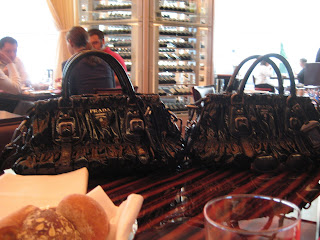 Big Glasses Girl and Gnarlitude Jen tagged me to name six things in my handbag. My favorite Prada bag has made an appearance on this blog before. Here it is, enjoying lunch with its identical twin.