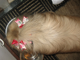 UPDATED TO ADD: It is quite chilly out today so I decided that this was not the right time for Henry to shed his winter coat. He just got a bath and a trim instead of a buzz cut. In case he gets invited to any special events, I picked out some “black tie” ear ornaments for him.