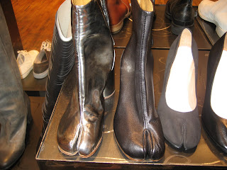 After testing some Jo Malone scents, we wandered into some more neighborhood stores, including If, where we saw the Martin Margiela “black bar” sunglasses that made such a splash on the runway. The shades blended into my dark bangs; they looked much more spectacular on Leah. She was camera-shy and wouldn’t pose in them. Neither of us wanted to try on these cameltoe shoes…