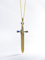 UPDATED TO ADD: A number of people have asked if I will do the Matilda Necklace in silver. If you have looked at it on my site, you’ve seen that this is an important piece that utilized the most highly skilled labor; it is priced accordingly. If I get enough serious requests, I’ll investigate doing the sword in silver, with different stones, as a stand-alone piece. The labor required to do the scabbard would, in my opinion, be excessive for silver.