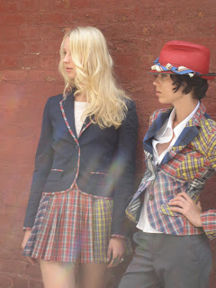 First, we’ve got two models wearing pieces from Christian’s line. That plaid blazer is so mine! You can count on my wearing that soon. The blonde is wearing my rings on her left hand.
