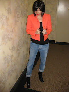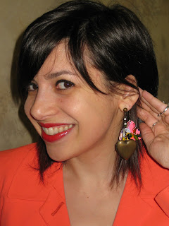 I love the blaze orange jacket, and the earring is very special!
