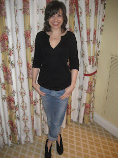 Here’s the head-to-toe photo from that night. I kind of love it that this look would be a total mindfuck for How Not to Look Old author Charla Krupp (Am I the only one who thinks she looks just a tad older than she is? Anyone? Anyone? Bueller?) On the one hand, she would approve of my lipstick. Trading red lipstick for boring pink with gloss is one of her fetishes. On the other hand, I’m sure she and other Fashion Police-type bitches would shit themselves over the fact that I wore cropped (well, rolled-up) pants and booties — totally breaking up the line of my leg and making me look stumpy. The horror!