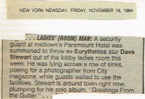 I wrote about Eurythmics member Dave Stewart in 2007, mentioning that I’d interviewed him in the mid-’90s. During the photo shoot for the story, we — Dave, me, the crew — got thrown out of a hotel ladies’ room. This week, I stumbled across the Daily News item that ran after the bathroom “scandal.” Next…
