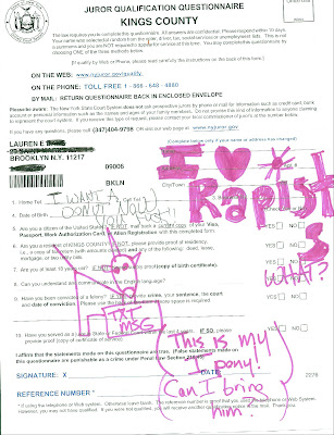 I must thank gorgeous blogger The Perfect Ratio for finding and sharing this wonderful juror qualification questionnaire. “I want a donut now, you fuck!!” is going to be my new personal motto.