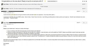 A lot of people think manufacturing jewelry (or anything, really) is about an idea and a sketch. But creating a product entails much more work than meets the eye. As the emails embedded in this post prove, I’d provided Eminem’s merchandising team with creative concepts and design direction for necklaces, earrings, and rings; determined pricing of the designs in various materials and quantities; produced physical sterling-silver samples; and made modifications and new designs as requested. I’d researched the use of black metal instead of silver at the request of the team just months before the other vendor’s dog tags appeared online.