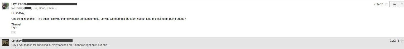 Finally, on Oct. 25, 2017, Eryn managed to get our lead merch-team contact on the phone for a one-on-one call which she later summarized this way: