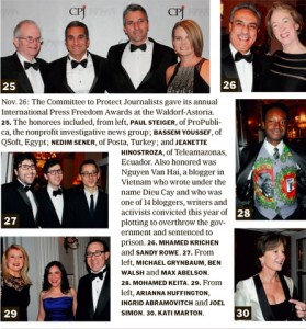 The Committee to Protect Journalists gave out its International Press Freedom Awards at the Waldorf Astoria last Tuesday, November 25. I wrote about CPJ’s importance in that day’s post on the movie Rosewater, which tells the story of Iranian-Canadian journalist Maziar Bahari. When Bahari was arrested in Iran in 2009 — and held and tortured…