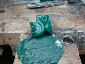I’ve been working on a swan ring to match my Cleves Necklace. Here is the necklace. Cleves Necklace © Wendy Brandes 2007-2009 Photo by John Muggenborg The Cleves Ring will have two swans facing each other, forming a heart with their necks. All together now: Awwwwww! Here is an unfinished wax model of the ring….
